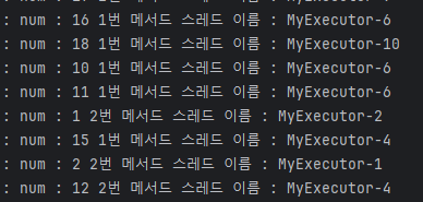 큐의 크기보다 더 많은 작업을 요청했을 땐 MyExcutor-10까지 사용되는 것을 확인할 수 있다.