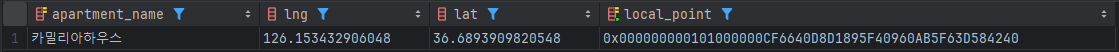 lng, lat는 varchar 타입의 문자열로 저장한 예시이고 local_point는 Point 타입으로 (경도, 위도) 형태로 저장되어 있다.